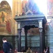 Под шатром из яшмы, лазурита и орлеца сохранилось место, где была пролита кровь императора - это часть плиты трутуара, булыжники мостовой и фрагмент решетки.