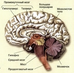 Головной мозг можно разделить на три части: большой мозг, занимающий почти всё пространство черепа (в него входят большие полушария, таламус, гипоталамус и гипофиз, от него зависит наша умственная деятельность и наш интеллект), малый мозг, или мозжечок, который находится в нижней части черепа сзади (в его ведении находится всё, что относится к волевой деятельности и двигательным возможностям нашего тела), и продолговатый мозг, по сути являющийся связующим звеном, из которого расходятся нервы вверх, в различные части головы и вниз, к органам расположенным в грудной клетке, в том числе и к дыхательным (находится в нижней части черепа перед малым мозгом и фактически с него начинается спинной мозг). Сам головной мозг – это не что другое, как большая масса нервной ткани.