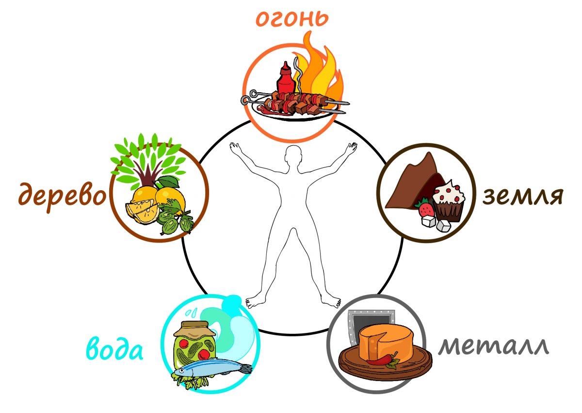 — Вода, Земля, Дерево, Металл и Огонь — это пять составляющих всей энергии циркулирующей по телу. Также как Инь и Ян регулировать её поступление в организм можно употребляя ту или иную пищу.