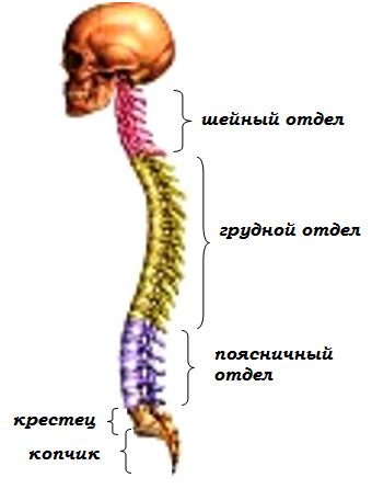 Самый верхний – шейный отдел – состоит из семи позвонков. Следующие ниже 12 позвонков составляют грудной отдел.  Ещё ниже – 5 позвонков поясничного отдела. Крестцовый и копчиковый отделы, сросшиеся в одну кость.